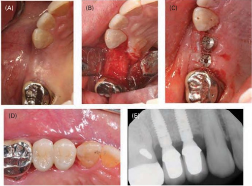 (A) Bốn tháng sau phẫu thuật GBR. (B) Đủ xương chiều ngang tại thời điểm đặt implant. Implant được đặt (C) và làm phục hình (D). (E) Phim quanh chóp của implant đã làm phục hình. Sau 4 tháng lành thương, xương phía ngoài đã tăng lên đáng kể, và 2 implant (đường kính 3.5 mm x chiều cao 11mm) được đặt (theo hướng dẫn của nhà sản xuất) mà không cần phải ghép thêm. Hai tháng sau cấy ghép, tiến hành làm phục hình trên implant.