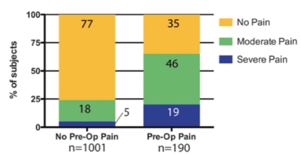 Mức độ đau trước điều trị là một yếu tố tiên lượng quan trọng của mức độ đau sau điều trị. Hình ảnh này cho thấy một ví dụ về một nghiên cứu chứng minh tần suất và mức độ nghiêm trọng của đau ngày đầu tiên điều trị tủy được tiên lượng dựa trên sự hiện diện của đau trước điều trị.