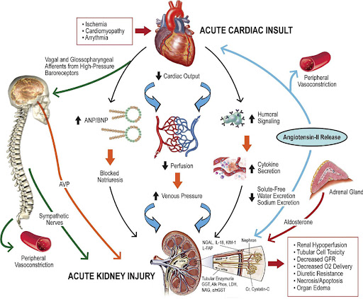 Minh họa cơ chế của Hội chứng tim thận (CRS). Nguồn: Cardiorenal Syndrome: Classification, Pathophysiology, Diagnosis, and Treatment Strategies A Scientific Statement From the American Heart Association