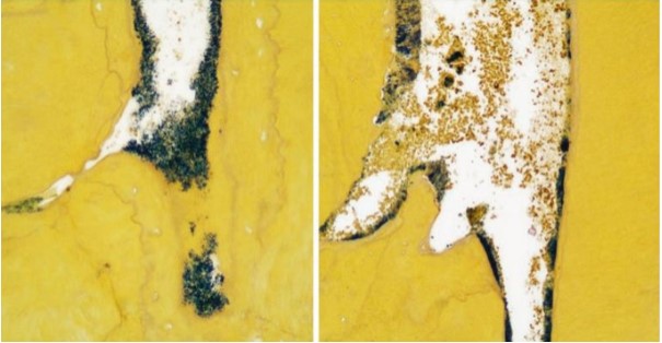 Nhiễm trùng ống tủy có thể lan ra những vùng khó làm sạch. (a) Một lớp biofilm phủ lên những thành ống tủy bất thường và những ống ngà phía dưới bị vi khuẩn trong biofilm xâm nhập. (b) Hình chữ nhật ở (a) được phóng lớn.