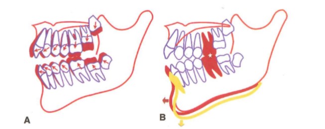 A, Chen chúc răng sau tạo nên hiệu ứng “squeeze out làm trỗi và đẩy các răng ra trước, đồng thời làm thay đổi mặt phẳng nhai. B. Đáp ứng thích nghi trong phát triển xương hàm với hiệu ứng “squeeze out theo kiểu thích nghi bằng cách phát triển ra trước (mũi tên đỏ) hoặc không thích nghi bằng cách xoay xuống dưới (mũi tên vàng).