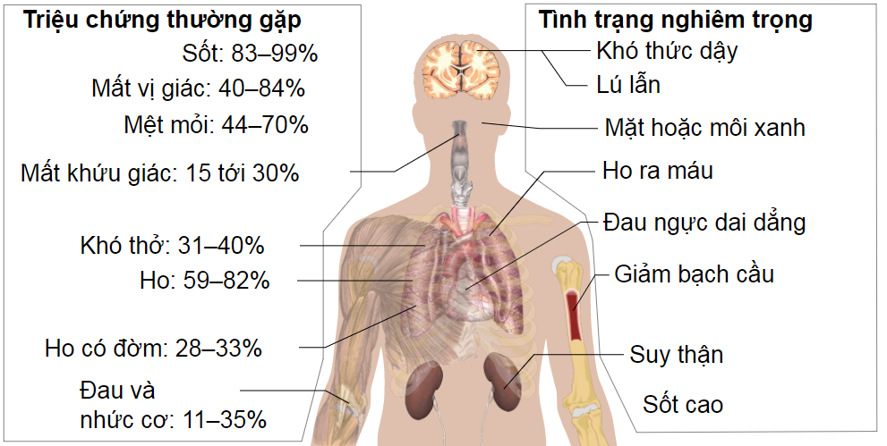 COVID-19 có thời gian ủ bệnh 2-14 ngày (trung bình 5,2 ngày). Khoảng 30% trường hợp nhiễm bệnh không có triệu chứng, nhưng bệnh khởi phát được đặc trưng bởi một loạt các triệu chứng lâm sàng như sốt, ho, khó thở, đau tức ngực, mất vị giác/khứu giác, thay đổi nhịp tim (đối với người bị tổn thương tim cấp tính).
