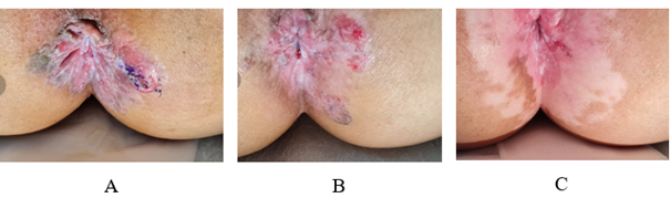 Hình 1: Hình ảnh sang thương vùng quanh hậu môn ban đầu (1 A), trong và sau khi điều trị (1 B, 1 C).