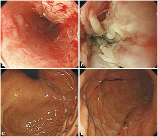 - Hình ảnh nội soi: trợt, sung huyết, dễ chảy máu khi chạm vào, xuất tiết và có thể hẹp. Tổn thương thường ở chổ nối thực quản – tá tràng hay thực quản – hỗng tràng.
