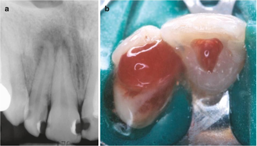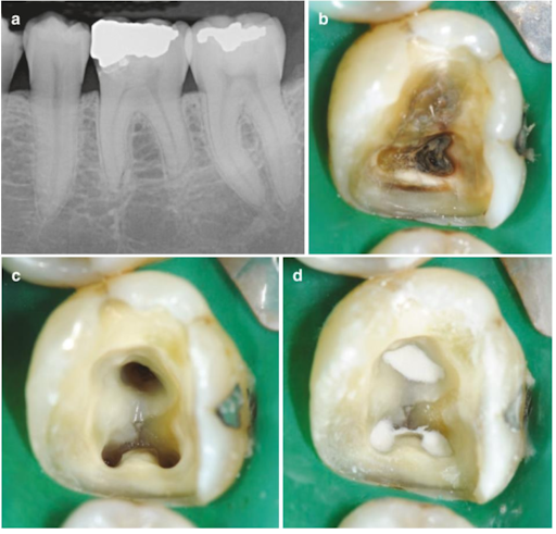 (a) RCL 1 hàm dưới được chẩn đoán viêm tủy có triệu chứng. Phim XQ cho thấy kẽ hở thân răng, vôi hóa buồng tủy và tiêu ngót chóp răng nghiêm trọng. (b) Phần thân răng sau khi đã loại bỏ vật liệu trám và mô răng sâu. (c) Hình ảnh buồng tủy sau khi mở tủy và sửa soạn lối vào. (d) Hình ảnh sau điều trị nội nha, ống tủy được trám bít bằng Ca(OH)2 nguyên chất trộn với nước muối vô trùng để đạt dạng kem.