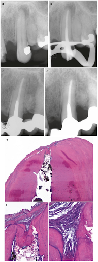 (a) Răng nanh hàm trên hoại tử tủy và viêm quanh chóp không triệu chứng ở 1 bệnh nhân nam 41 tuổi. (b) Ống tủy được sửa soạn và băng thuốc với Ca(OH)2. 1 tuần sau răng được trám bít ống tủy bằng phương pháp nhồi dọc với GP và cement bít. (c) XQ kiểm tra sau 9 năm có thể thấy tình trạng mô quanh chóp bình thường. Răng không có triệu chứng. (d) 19 năm sau bệnh nhân trở lại với triệu chứng sưng nướu mặt ngoài. Thăm dò cho kết quả độ sâu túi nha chu mặt ngoài là 8 mm. XQ kiểm tra cho thấy 1 khiếm khuyết xương ở góc xa. Lưu ý hình ảnh mô quanh chóp vẫn rất bình thường. Răng được chẩn đoán là gãy dọc và đã được nhổ bỏ. (e) Lát cắt ở gần trung tâm ống tủy, bao gồm cả đoạn ống tủy chóp và lỗ chóp (foramen). Quan sát thấy sự hiện diện của mô bị canxi hóa ở đoạn ống tủy cận chóp (nhuộm hematoxylin và eosin). (f) Hình ảnh chi tiết foramen. Hiện tượng canxi hóa mô xảy ra và lấn chiếm đoạn ống tủy cận chóp này giống như cement, và nó bị cắt ngang bởi 1 dải sợi mô liên kết. Mô nha chu còn sót lại trên bề mặt chóp chân răng khi nhổ răng ra thì thấy không bị viêm. (g) Hình ảnh chi tiết mô mềm tại foramen. Chỉ quan thấy các nguyên bào sợi và sợi collagen, không hề có tế bào viêm nào.