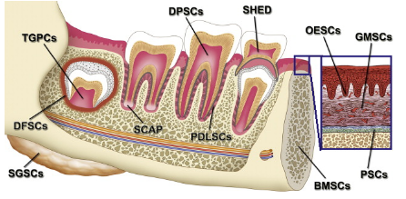 Từ nang răng: tế bào gốc nang răng (DFSCs), tế bào tiền thân mầm răng (TGPCs). Từ răng sữa: tế bào gốc tủy răng sữa (stem cells from human exfoliated deciduous teeth – SHED). Từ răng trưởng thành: tế bào gốc tủy răng (DPSCs), tế bào gốc nhú đỉnh (SCAP), tế bào gốc dây chằng nha chu (PDLSCs). Từ các cấu trúc ngoài răng: tế bào gốc vỏ xương (PSCs), tế bào gốc tủy xương (BMSCs), tế bào gốc trung mô từ nướu (lợi) răng (GMSCs), tế bào tiền thân nội mô răng (OESCs), tế bào gốc tuyến nước bọt (SGSCs).